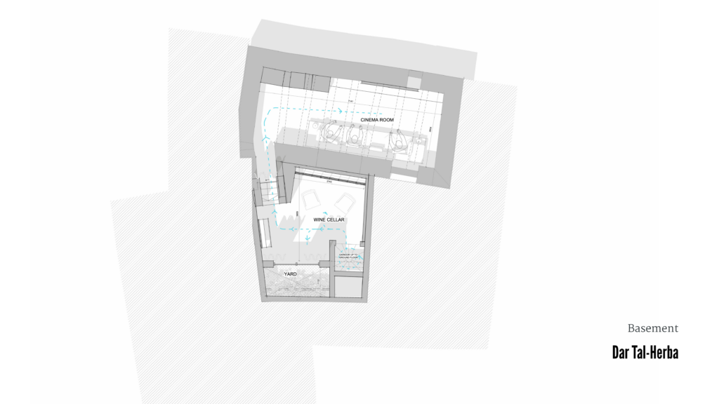 The ground floor accommodates the primary living spaces, including the living room, dining-kitchen, guest bathroom, and a bedroom. Both the dining-kitchen and bedroom open onto the internal courtyard, reinforcing the relationship between indoor and outdoor spaces. A traditional garigor is carefully retained, descending to a basement level that houses a wine cellar and an adjacent cinema room.
