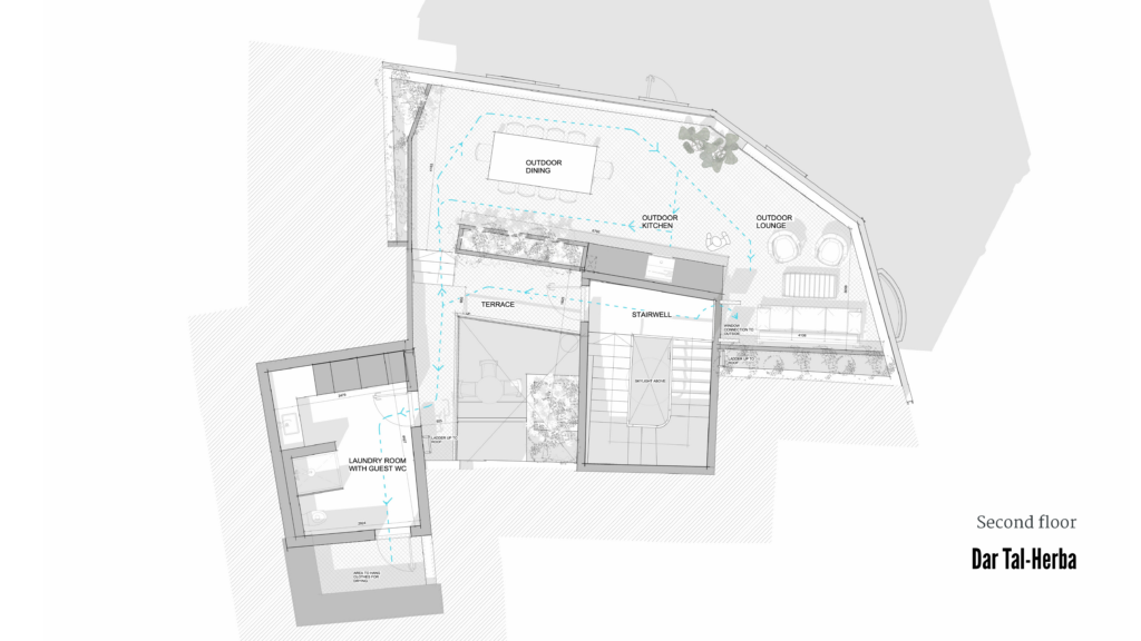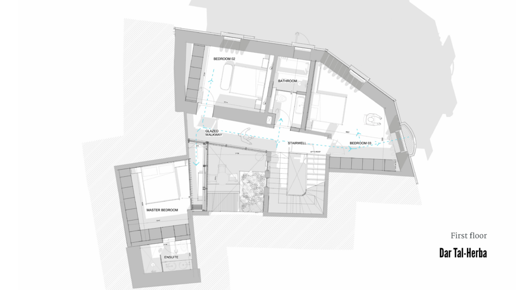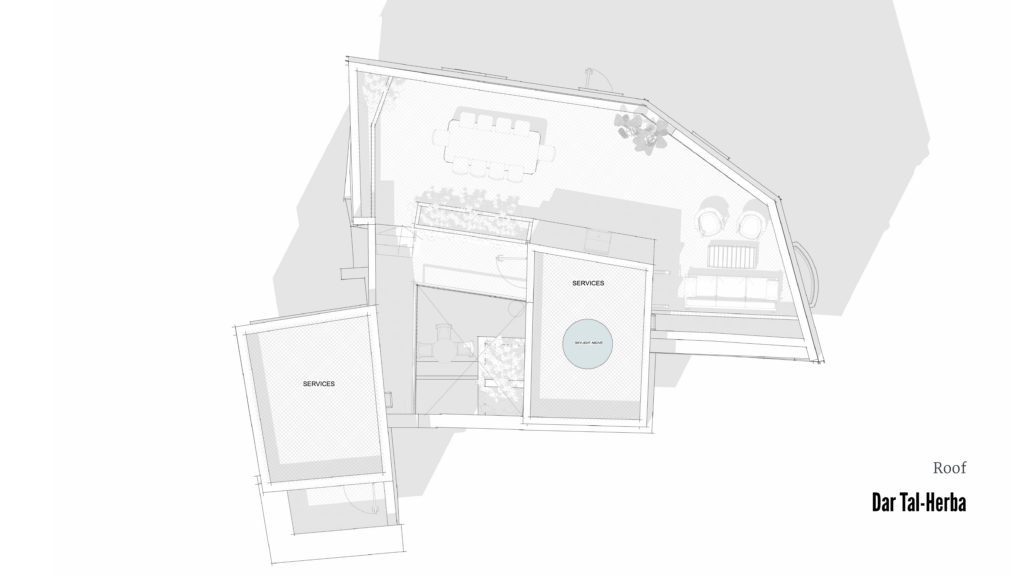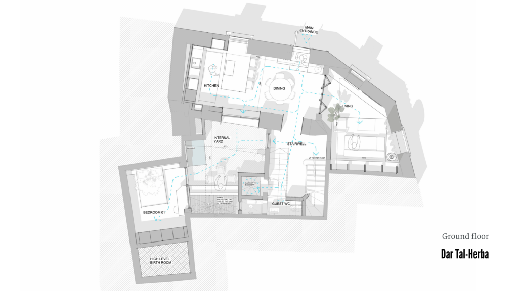 Located in the heart of Birkirkara’s Urban Conservation Area Dar tal-Ħerba breathes new life into Triq tal-Ħerba. By reconnecting two former residences into a single dwelling, the project re-establishes a prominent corner house with an expansive façade overlooking the Church of St. Rocco. The intervention reinterprets the existing masonry walls to frame a central courtyard that forms the heart of the home.
