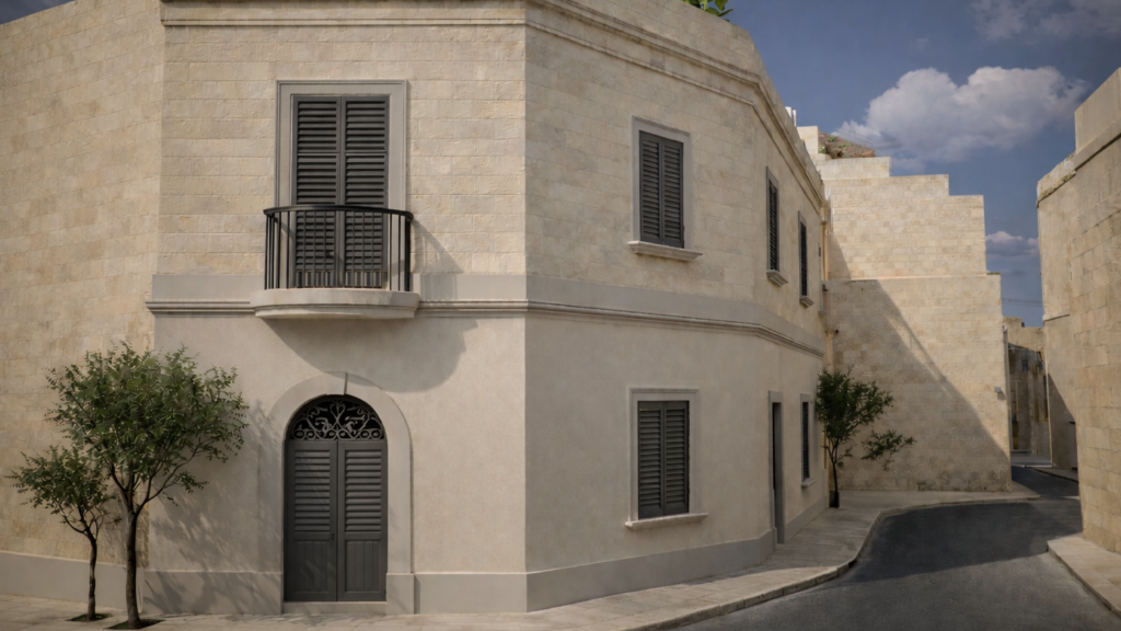 Our latest project in Birkirkara reflects this approach. Located within an Urban Conservation Area and overlooking the Church of St. Rocco, this corner townhouse brings together heritage restoration, architectural clarity, and contemporary spatial design.